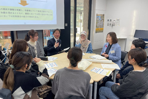 【参加議員】 自由民主党:浅田ますみ議員、冨岡孝介、改革21:饗󠄀庭敦子議員、公明党:本多泰邦議員、 日本共産党:堀江ひとみ議員、もったいないよ 長崎:大倉聡議員 【参加学生】 長崎県立大学国際社会学科の学生 18名 |