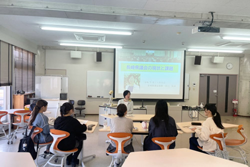 演題:「長崎県観光の現状と課題」、「長崎県議会の現状と課題」 演者:白川鮎美議員 対象:長崎女子短期大学の学生 5名(観光進化論の履修者) |