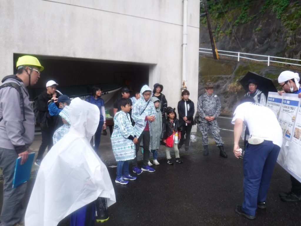 ダムではその役割について学んでもらうために、元気な子供たちと一緒にクイズを行いました。クイズでは大雨時に水を貯めることや、川の水を枯れさせないこと、水道用水の供給について説明したところ、参加者の方々は興味津々に話を聞いてました。