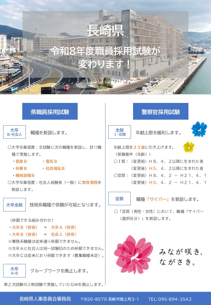 令和8年度に実施する長崎県職員採用試験及び長崎県警察官採用試験について、以下のとおり変更します。