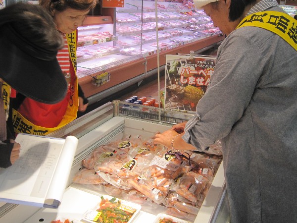 ・調査の実施要領を説明後店舗に移動し、2班に分かれて、生鮮から加工食品までの表示を確認したり、店舗の衛生管理や放射温度計による品温の確認などを行った。