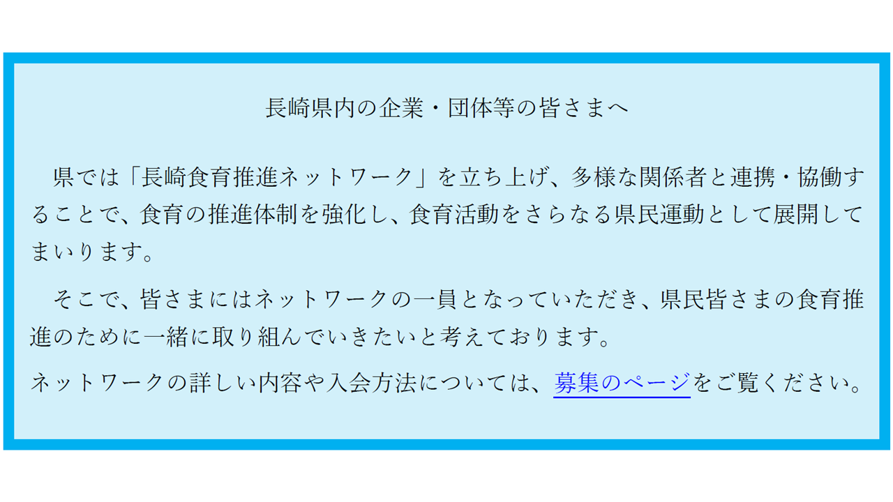 「長崎県食育推進ネットワーク」とは、長崎県において食育に取り組む関係者が参画し、
