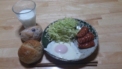今回はパンが主食だったので、飲み物を牛乳にしてカルシウムも一緒に摂れるようにしました。 カルシウムは日頃なかなか摂れないのでパンのときはいつも牛乳にするように心がけています。 また、野菜や卵などもつけて栄養バランスの摂れる朝食にしました。
