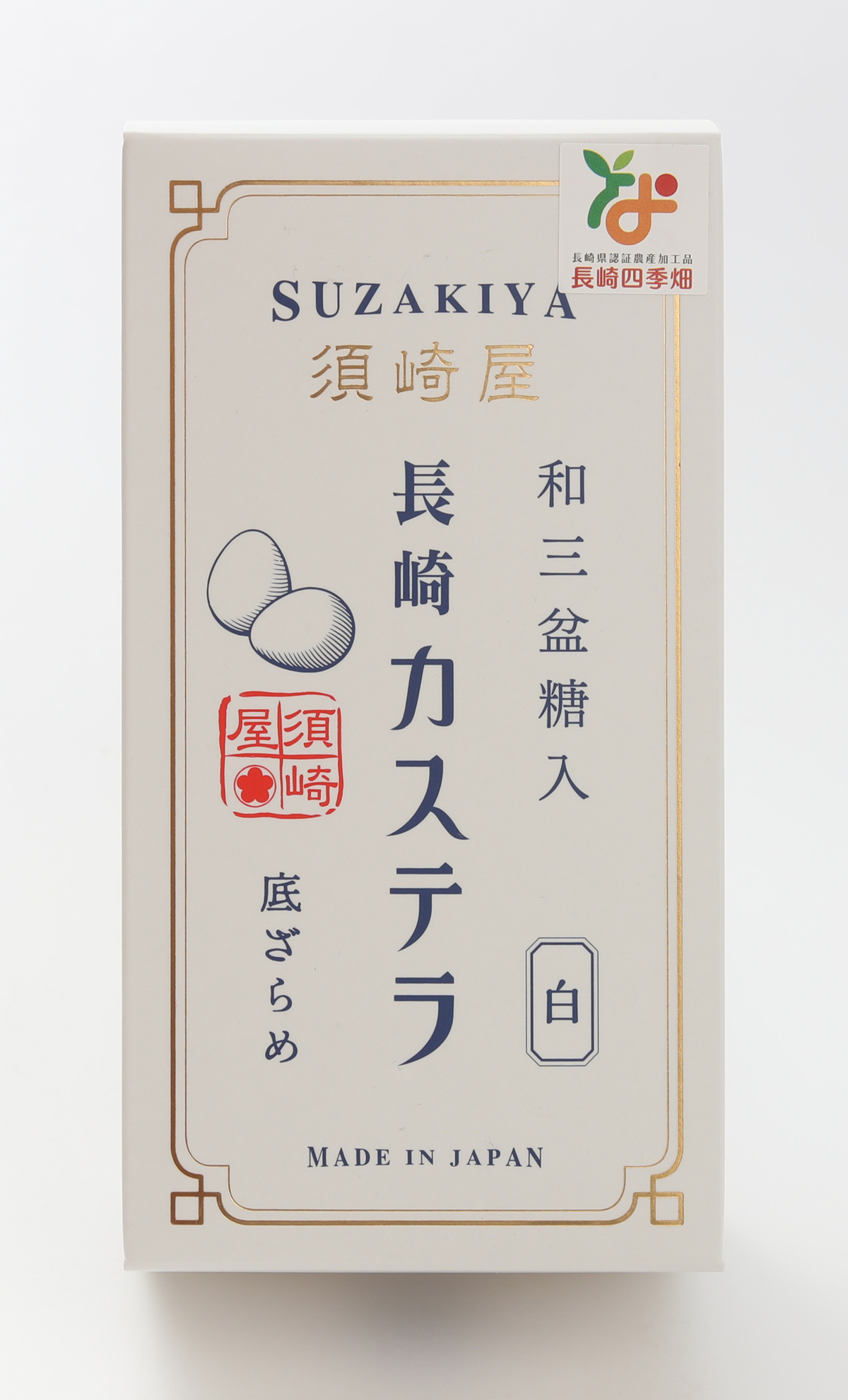 創業1867年、五三焼かすてらの老舗「須崎屋」が焼き上げる珍しい白いカステラです。無農薬で育てられたお米を食べた鶏が産んだ黄身まで白い米卵、香り立つ佐賀のもち米飴、上品な甘みの阿波産の和三盆糖、純度の高い氷砂糖にざらめ糖、シンプルながら、こだわった原材料を使って、丁寧に焼き上げました。きめ細やかな白い生地のカステラは、お祝い事などに自信をもってお使いいただける逸品です。食感と風味の追及のため、手焼きに、素材にこだわり熟練の技を継承しています。