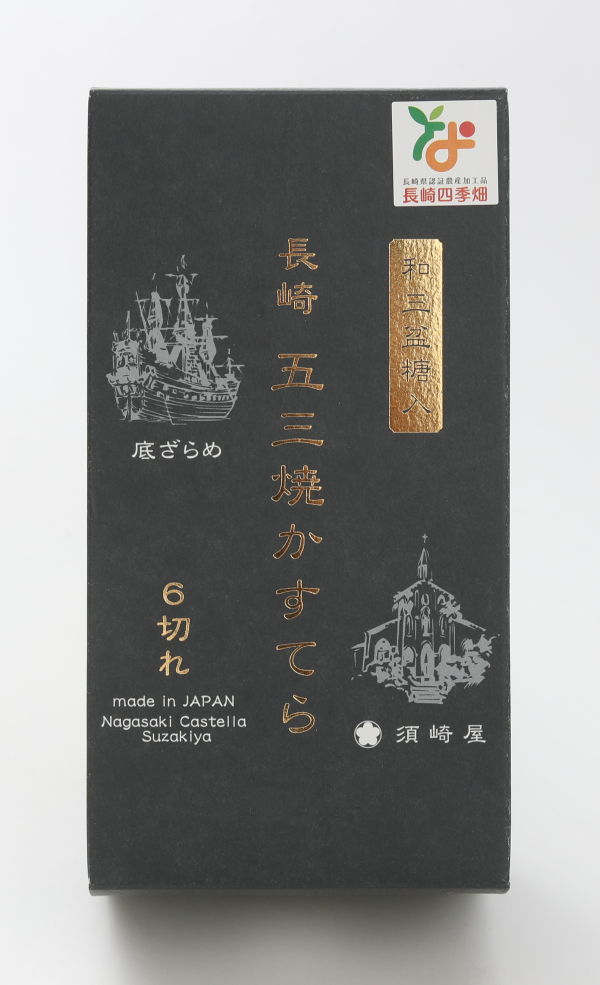 食感と風味の追及のため、手焼き製法と素材にこだわった熟練の技を継承しています。通常のかすてらの配合に更に卵黄を加えて焼き上げる五三焼には、熟練の技が必要です。天地返し、中混ぜ、泡切、仕上げと4回の手をくわえ、食感を追及。原料には、より風味を引き立てるため阿波の和三盆、長崎のブランド卵、佐賀の最高級餅米飴を使用、150年以上の菓子屋の経験を更に進化させたワンランク上の長崎かすてらです。