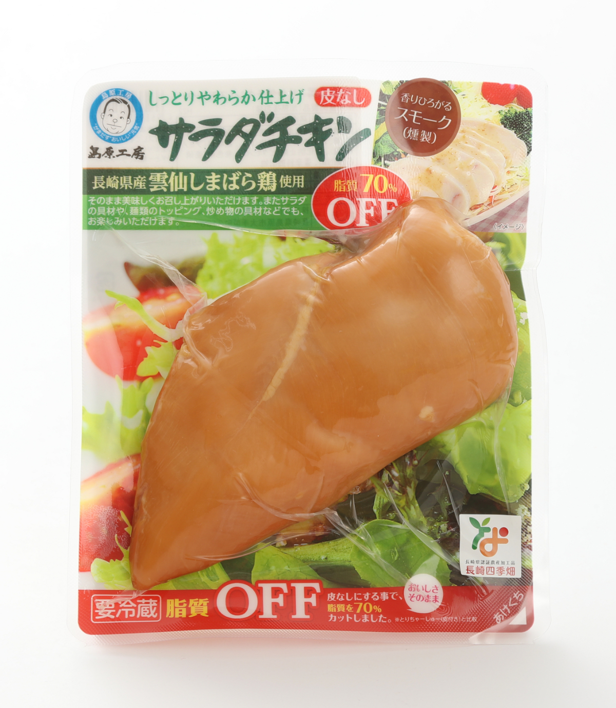 長崎県島原半島で育てられた『雲仙しまばら鶏』のむね肉を使用し、特製液に漬け込んでスモークした商品です。皮なしにすることで脂質を70%カットしました。(弊社商品『とりちゃーしゅー』と比較)